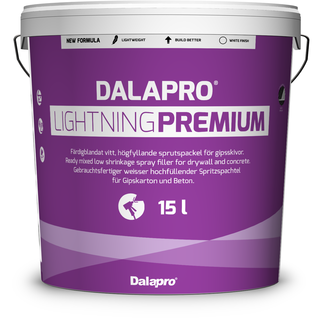 Dalapro Lightning Premium er en færdigblandet hvid sprøjtespartelmasse til spartling af samlinger/fuldspartling og overfladebehandling af gipsplader.